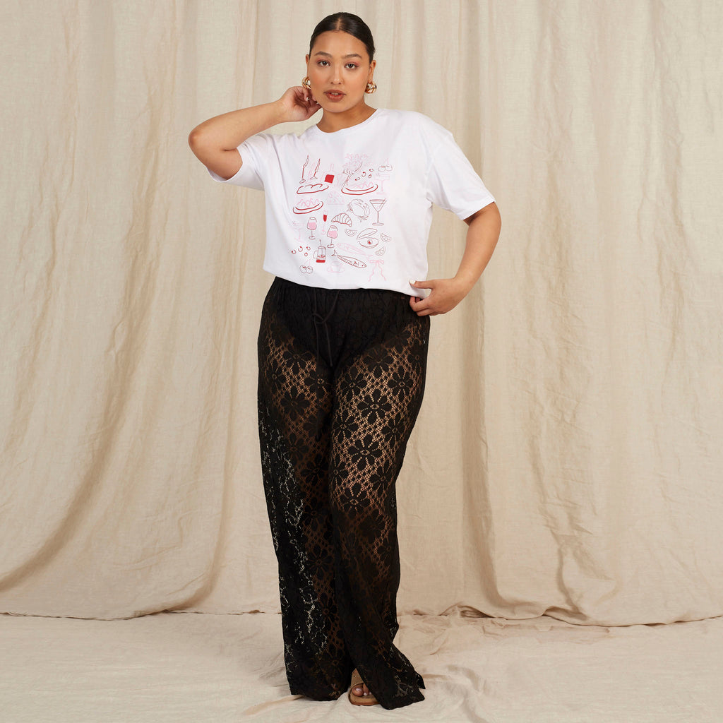 Crochet has been a St Tropez beach staple since Brigitte Bardot said so. Meet our beach trousers in floral knit. Style with a retro t-shirt or our Cheri top for the perfect date night