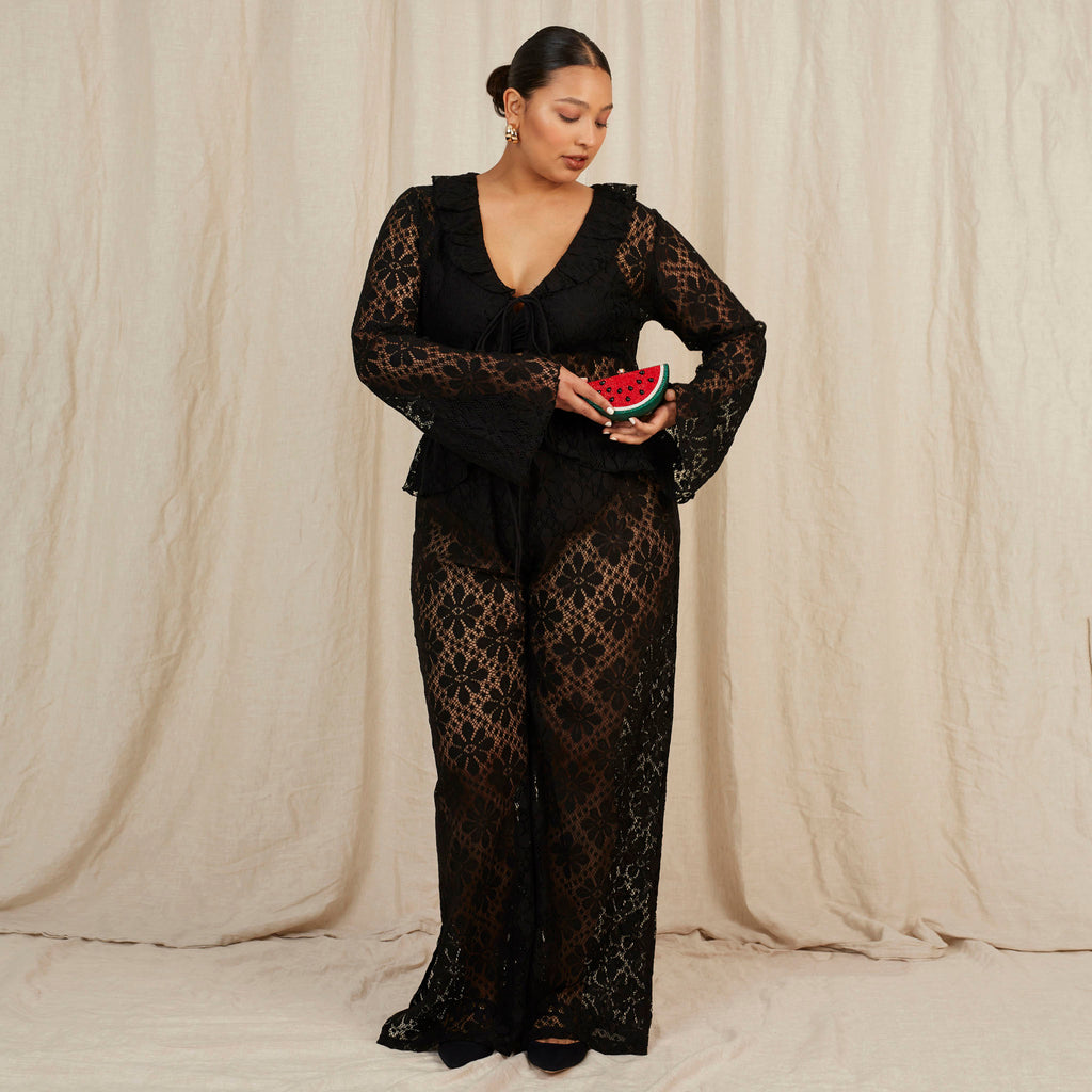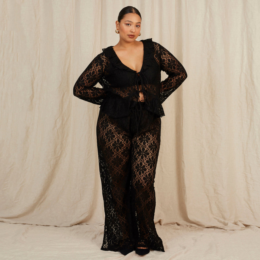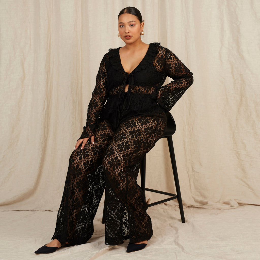 Mon Cheri. In caviar black. Our ruffled crochet top features a flared sleeve in floral knit and tie front detailing. Best paired with the Audrey trousers for co-ord cool.