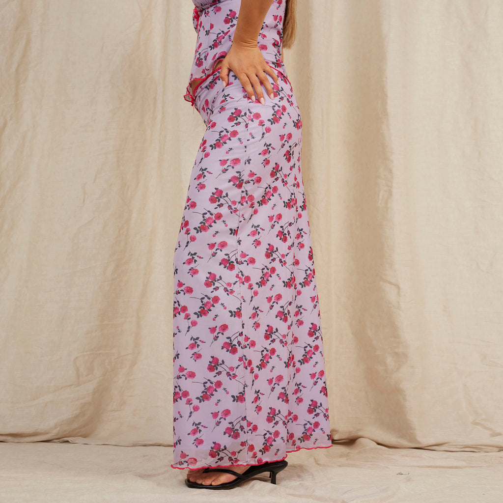 Introducing the Estelle skirt. A body hugging stretch mesh skirt with lettuce edging in a lavender floral print. Best paired with the Estelle top, to make Adriana La Cerva proud.