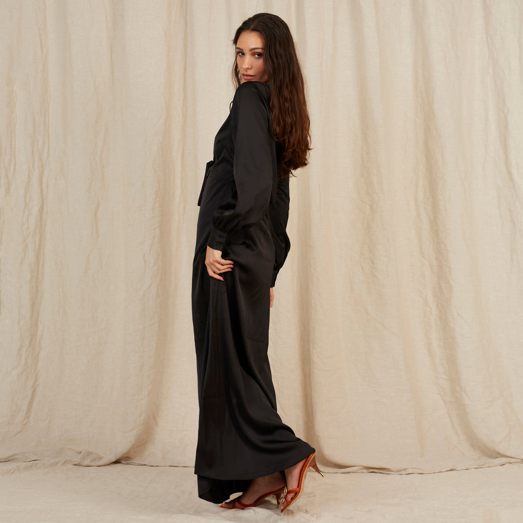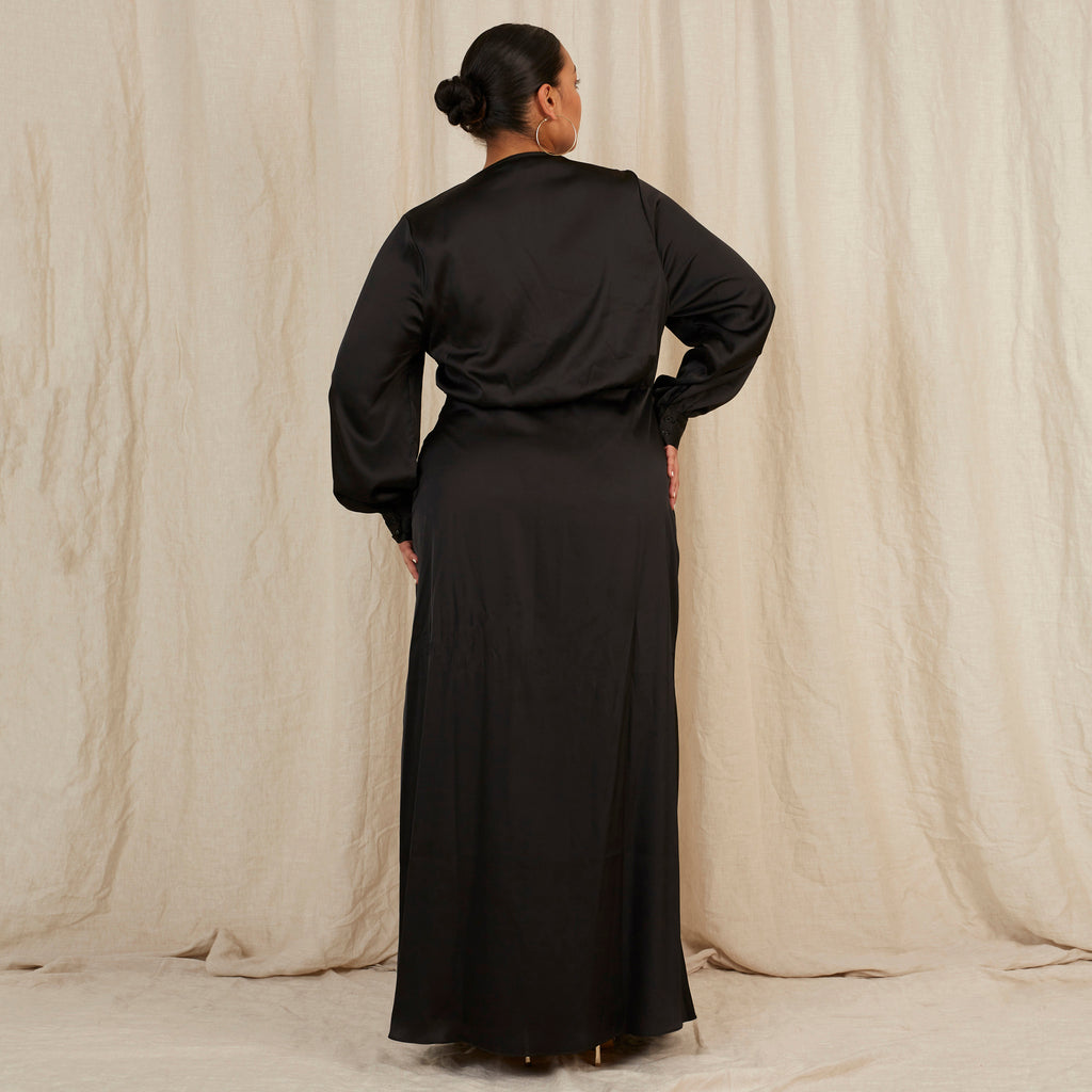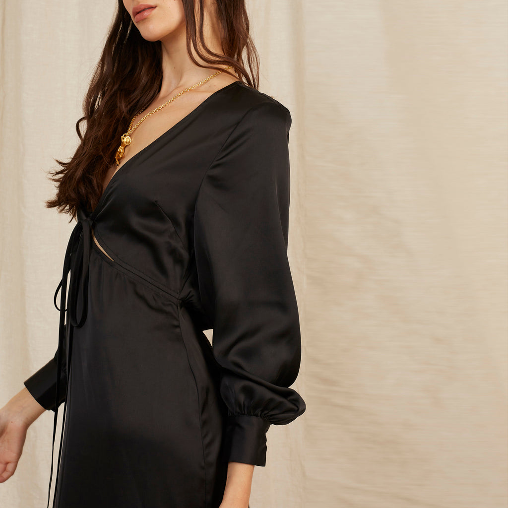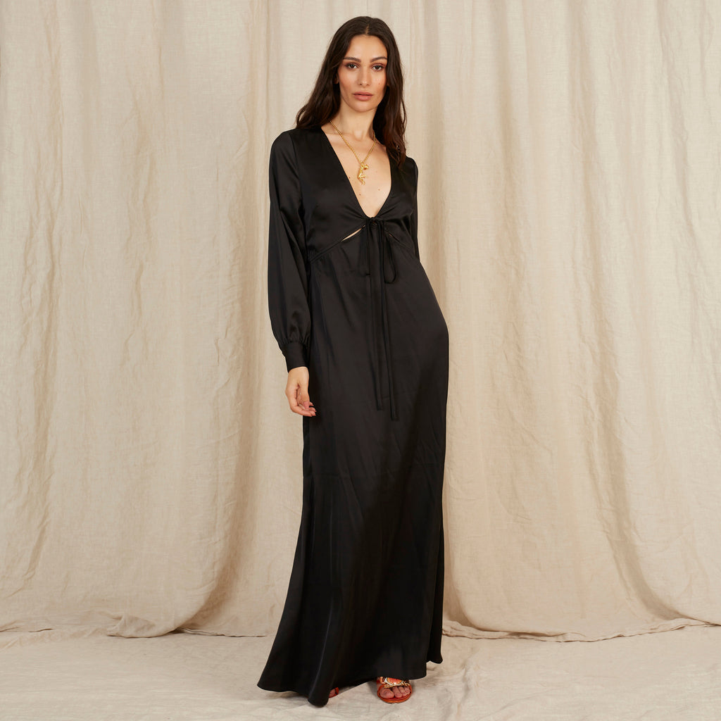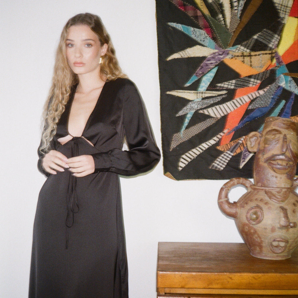 Everyone loves Frankie. In Caviar Black, this floor length dress is bra-friendly with a plunging neckline. She's the perfect throw-on dress to master the "effortless" french girl chic.