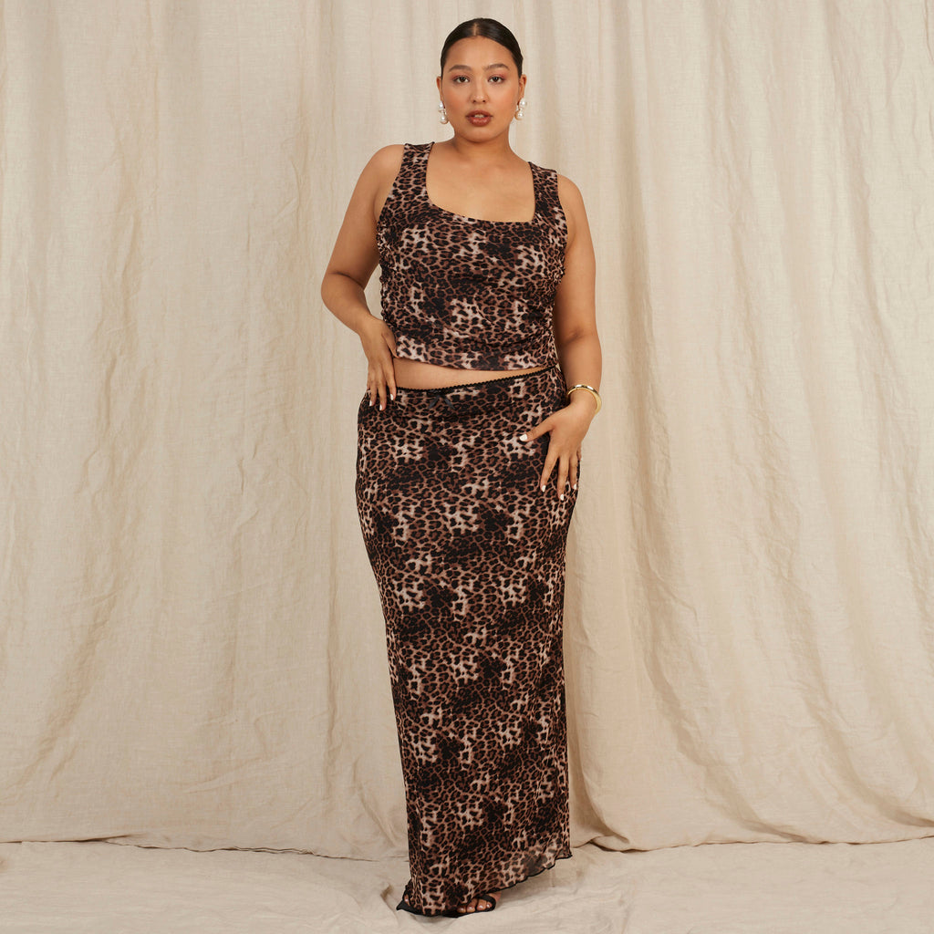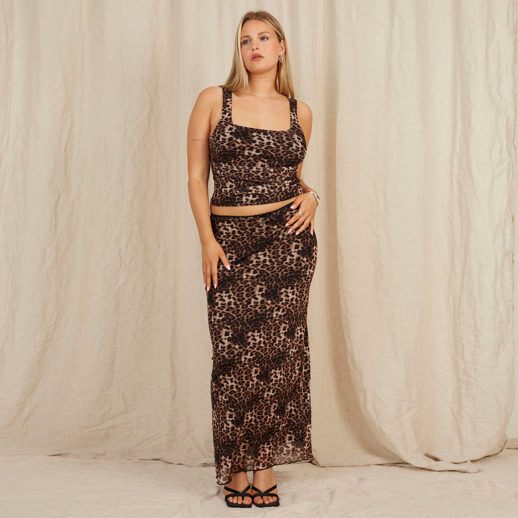 Introducing the Lana skirt. A body hugging mesh skirt with lettuce edging in a classic leopard print. Best paired with the Lana top, to make Adriana La Cerva proud.