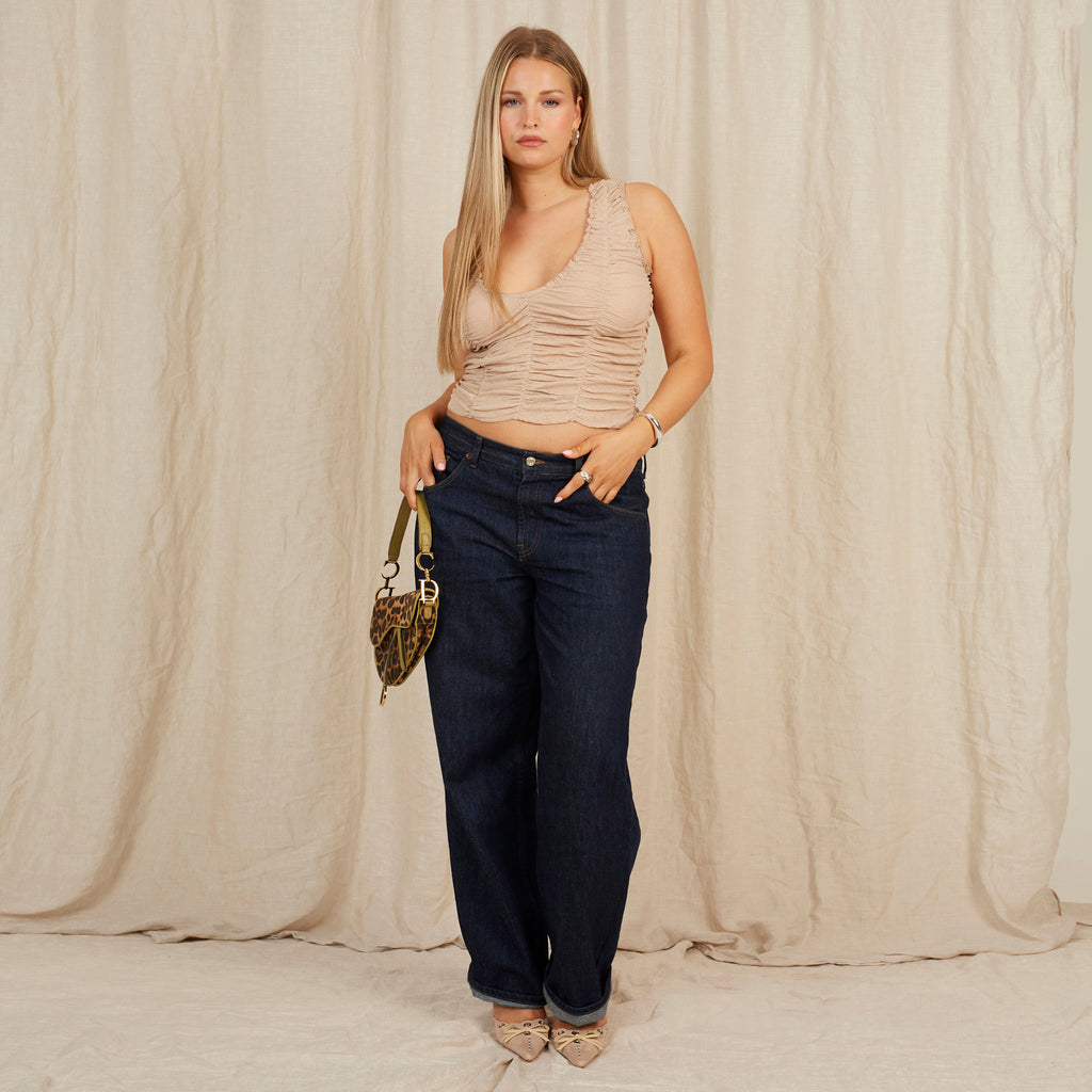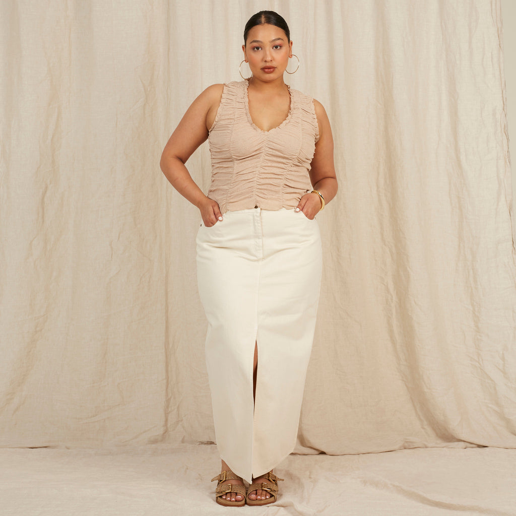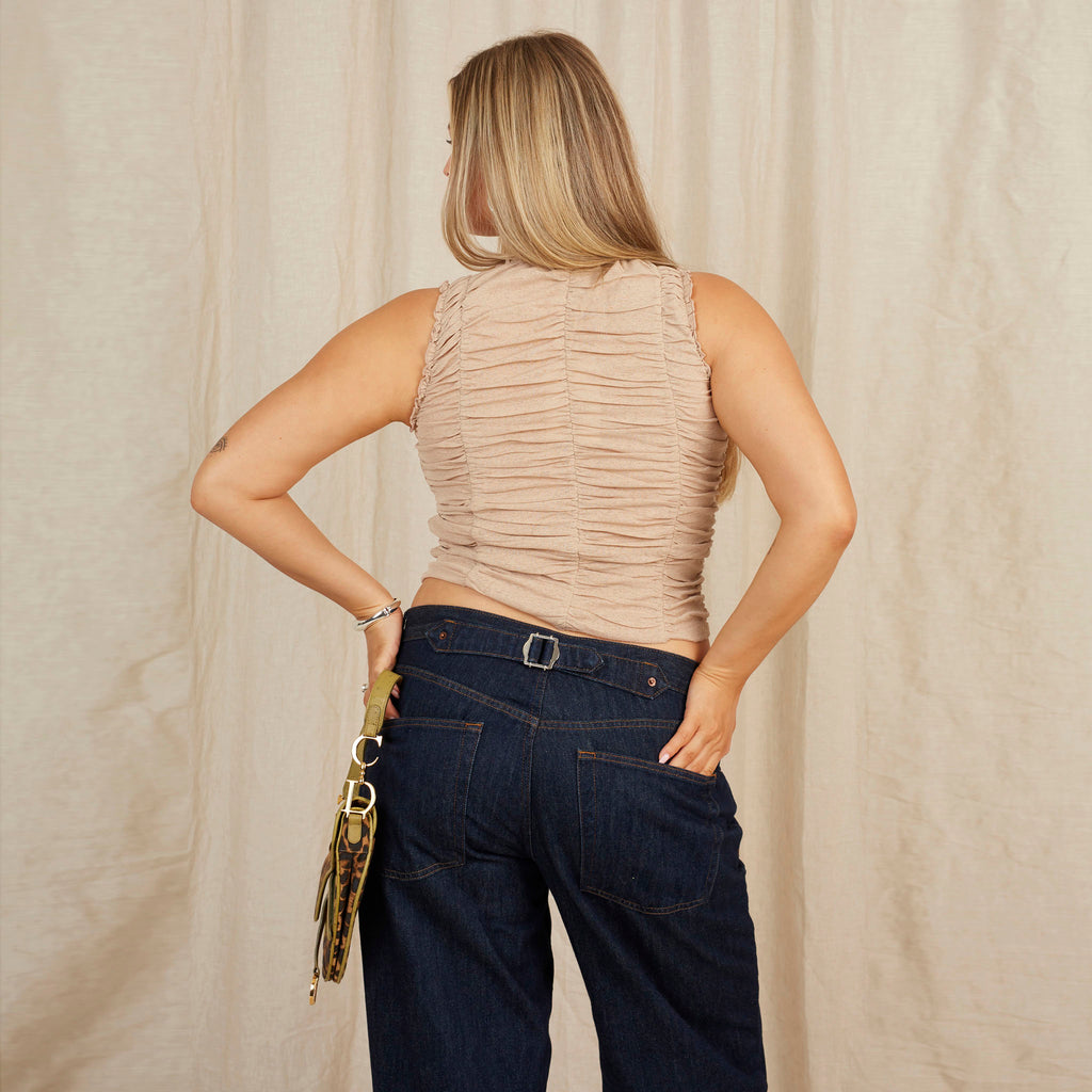Have you met Nia? Our demi-sheer vest in Sand. Featuring seamed panelling and rouching. Can be worn either way for more or less decolletage.