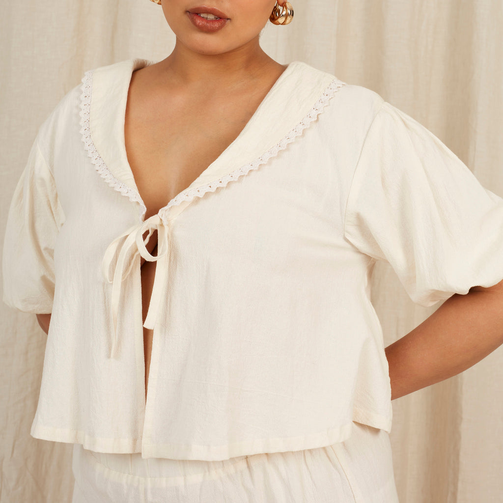 Have you met Sara? Our linen blouse in Vanilla Cream with puff sleeves and single tie front. Featuring a peter pan collar with a delicate crochet trim. Best paired with the Sara shorts for the cutest co-ord.