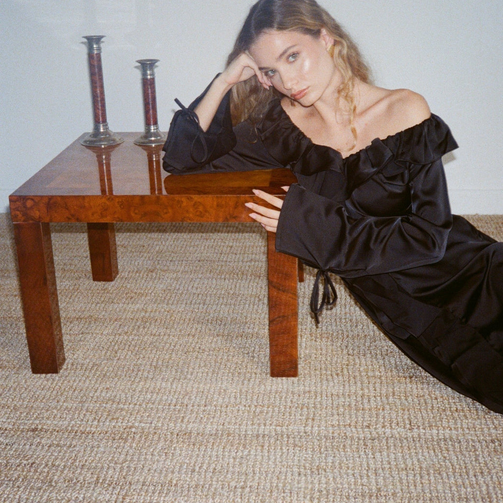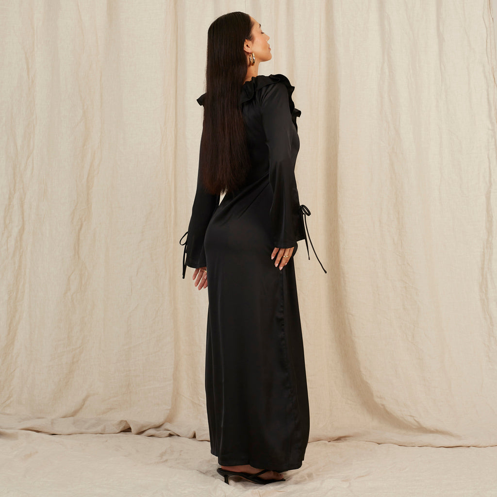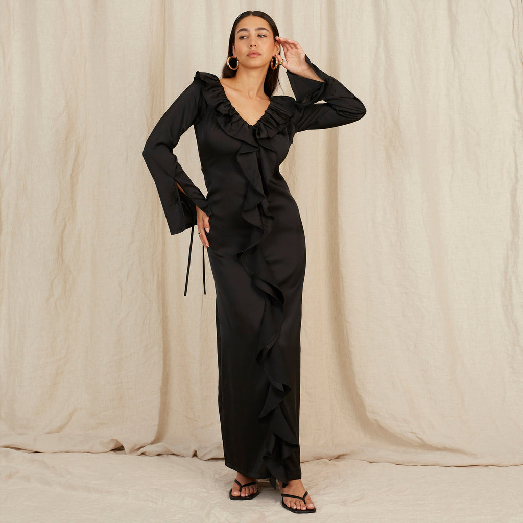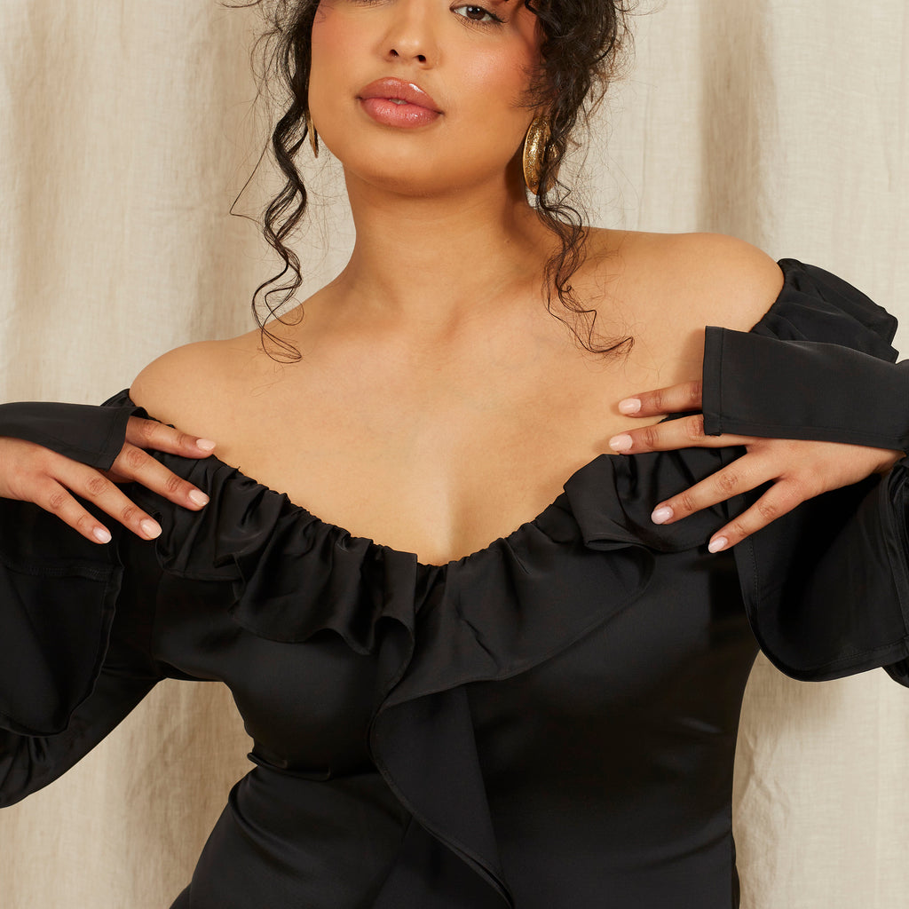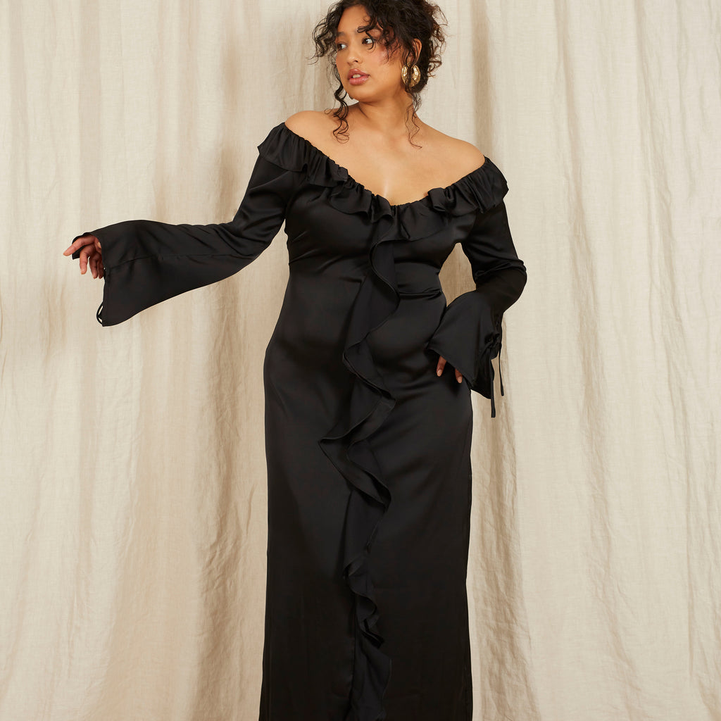 Meet Violet, your future favourite in Caviar black. Floor length featuring ruffled edges and a bell sleeve. Our off-shoulder neckline is designed to shrug off unwanted attention.